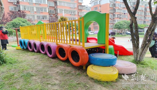 荊楚網(wǎng)(湖北日報網(wǎng))訊(通訊員 丁元中)近日,鄂城區(qū)西山街道石山社區(qū)觀瀾花園小區(qū),經(jīng)過創(chuàng)意涂鴉,廢舊輪胎“搖身一變”,成了一個個色彩斑斕的彩色衣裳,不少兒童正在輪胎搭建而成的滑梯、蹺蹺板、秋千等娛樂設(shè)施上面玩耍。一旁的健身器材上,一些老人正在鍛煉身體,原來空無一物的休閑廣場已成為一個廣受居民歡迎的新去處。