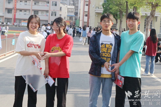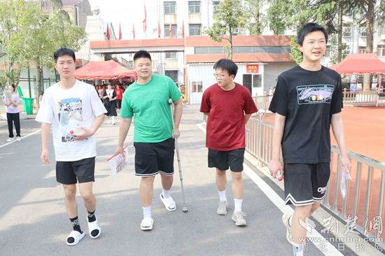 他們當(dāng)中有的考生身穿紅色衣服,預(yù)祝考試大捷;在進(jìn)考場前,有的考生圍在一起,擺出愛心的手勢,露出自信的笑容,高呼“戰(zhàn)勝高考,我能,我一定能”的口號響徹云霄;有的考生雖然在考前腿部或頭部受傷,但他們沒有顯示畏懼的神態(tài),反而展現(xiàn)了更堅強(qiáng)的毅力與一往無前的勇氣,面帶笑容,堅定地邁入考場……一幕幕從容的畫面詮釋著勇毅前行,一張張自信的笑臉展示著超越自我。