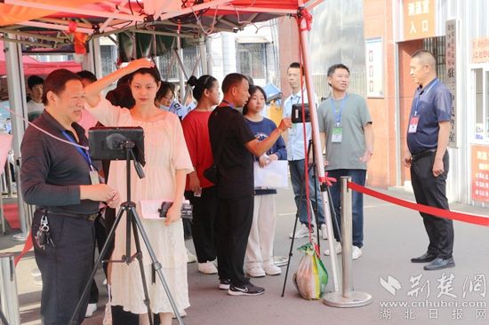 現(xiàn)場,考生排著整齊的隊伍,接受考點(diǎn)身份驗證及安檢檢查,陸續(xù)步入考場。