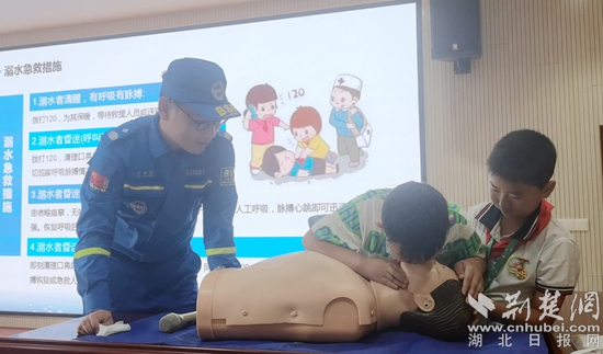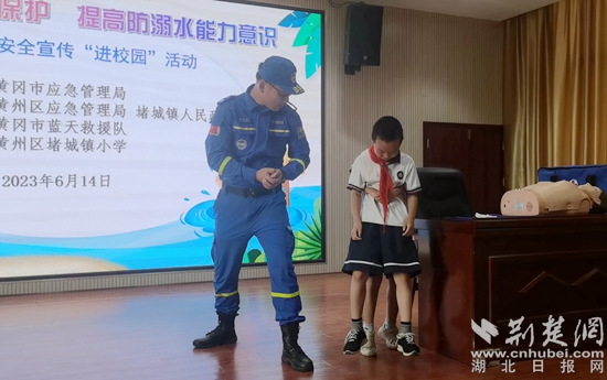 走進(jìn)堵城小學(xué),來自黃岡市藍(lán)天救援隊(duì)的專業(yè)講師正向同學(xué)們宣傳防溺水安全知識(shí),對突發(fā)溺水應(yīng)急處置、心肺復(fù)蘇術(shù)等自救互救技能進(jìn)行了演示。