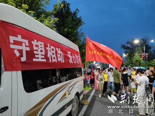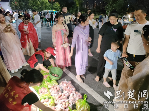 當(dāng)天下午六點,大冶市靈杰國風(fēng)志愿服務(wù)隊兵分兩路,分別在恒達(dá)歡樂大世界和雨潤廣場將農(nóng)戶的桃子一袋袋的分揀好,早早地將夜市攤擺上,為了讓路人能直觀看到桃子的品質(zhì),他們將散裝桃子一個個切好給來往的行人品嘗。