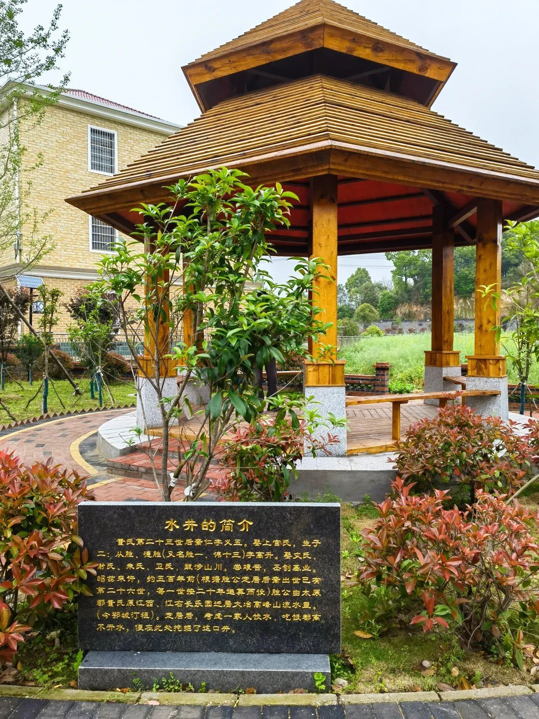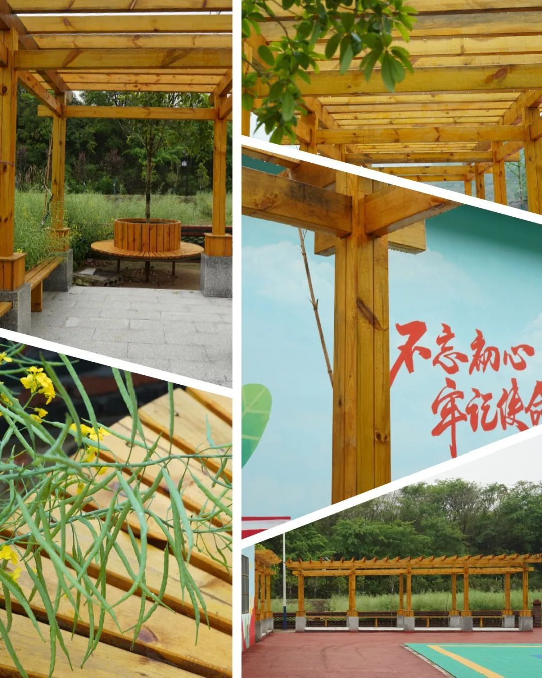 將農(nóng)具鑲嵌在墻上村民休憩的長(zhǎng)廊與涼亭