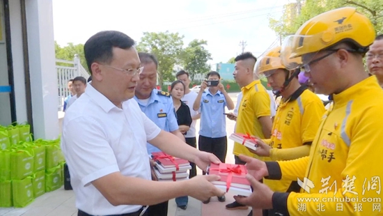 儀式上,紅安縣委常委、組織部部長余宏波向外賣騎手代表贈送黨的二十大精神學習資料及愛心物資。