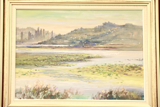 第一幅畫,展示的是數(shù)只船舶在新港碼頭裝卸貨物的繁華景象。第二幅畫,卡車進(jìn)入棋盤洲綜合保稅區(qū)外卡口的實(shí)景記錄。第三幅畫,描繪的是園區(qū)夜間工廠燈火通明、24小時(shí)生產(chǎn)不停的場景。第四幅畫,以綠色為底色,展示的是人與自然和諧共生的美景。第五幅畫,描繪的是棠梨湖商業(yè)街的街景。