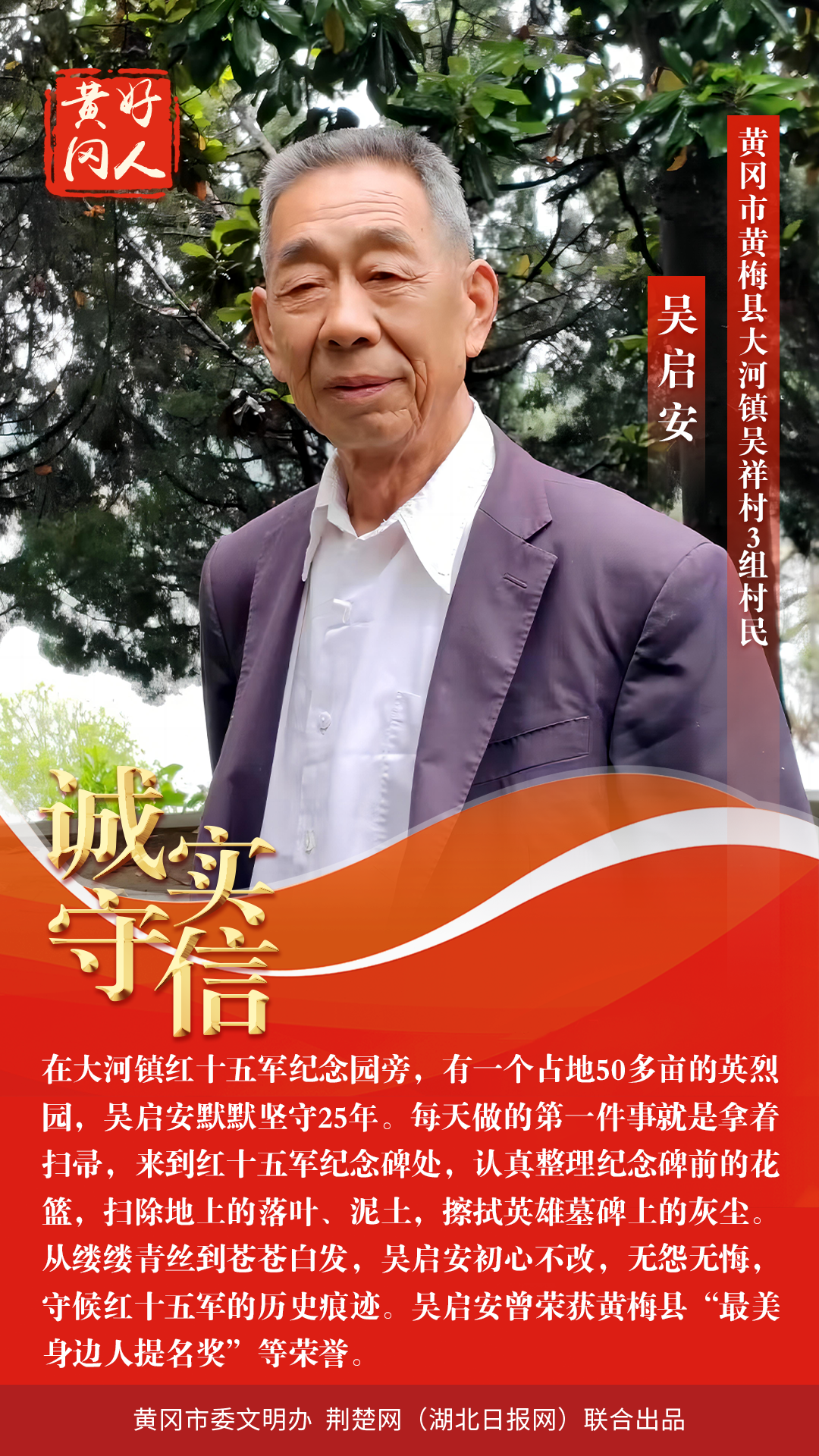 本期“黃岡好人”共有5組好人入選。他們中有“敬業(yè)奉獻,扎根商海40余載”的樊漢明;有“默默堅守25年,義務管理紅十五軍紀念園”的吳啟安;有“孝老愛親,被譽為大山里‘好兒媳’”的王志珍;有“見義勇為,先后5次救起落水群眾”的王臘;有“誠實守信,熱心勸學建書屋”的畢紅平。