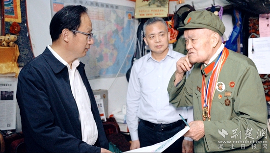 當天上午,黃石市委宣傳部副部長、市委網信辦主任萬金光,黃石市退役軍人事務局黨組書記、局長陳鵬圖一行參加啟動儀式,并前往抗美援朝老戰(zhàn)士瞿介昌住處看望。他們向瞿介昌老戰(zhàn)士簡單介紹了本次主題報道情況,向這位老英雄獻上了鮮花,表達了對退役軍人的敬意,并為“致敬英雄”采訪團授旗。
