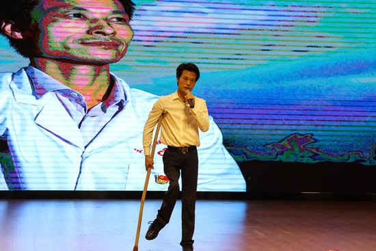 杜詠梅的《牽手》,講述了一位教師與一名自閉癥兒童的故事。“吾國(guó)萬(wàn)疆以仁愛,千年不滅的信仰......”現(xiàn)場(chǎng)觀眾應(yīng)節(jié)合拍,氣氛達(dá)到了高潮。