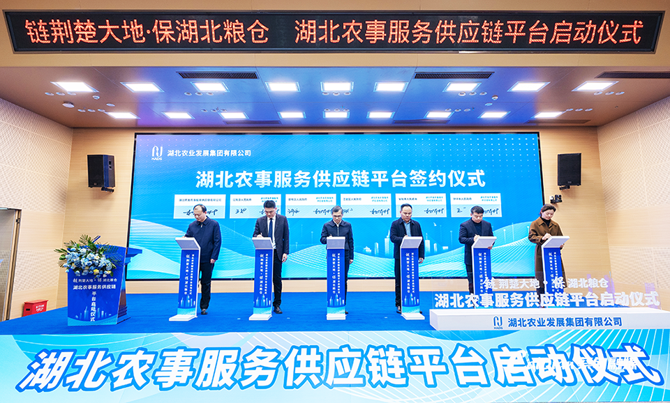 荊楚網(wǎng)(湖北日報網(wǎng))訊 (通訊員周雄、吳亭 、李偉恩、付琪)12月21日,湖北農事服務供應鏈平臺啟動儀式在湖北農發(fā)科研大樓舉行。湖北農發(fā)集團黨委書記、董事長朱萬奎和蔡甸區(qū)委書記余從斌,共同為湖北農發(fā)農事服務供應鏈有限公司揭牌,標志著湖北農事服務供應鏈平臺正式啟動運營。湖北農發(fā)集團總經理楊良鋒出席啟動儀式并致辭。