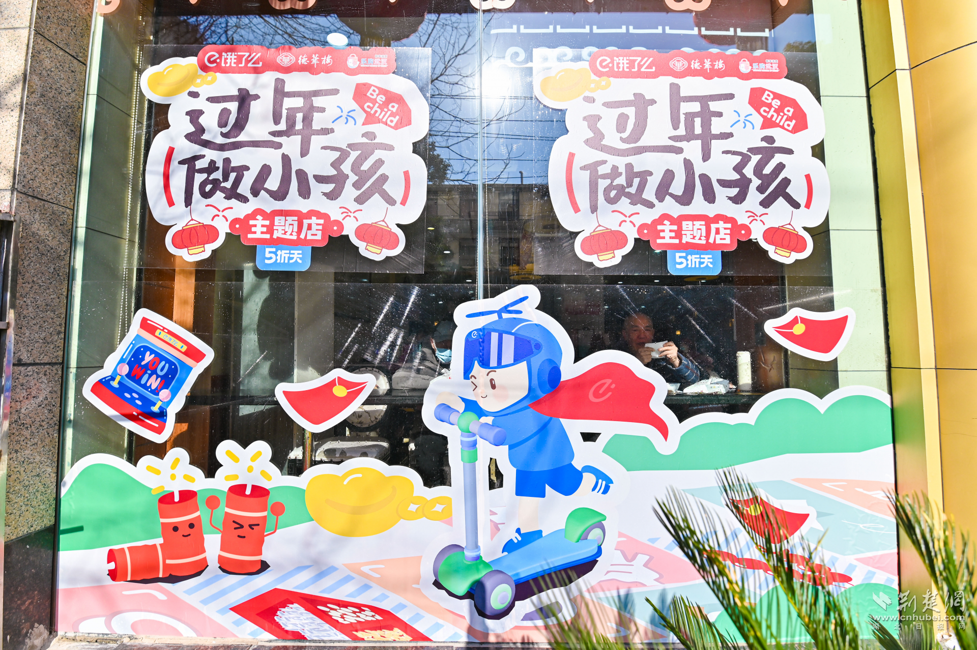 當(dāng)天,德華樓六渡橋店變身年貨快閃店,門口大鐵鍋現(xiàn)炸的熱氣騰騰的肉圓子,一字排開的水磨年糕、餃子等,以及排著長隊打年貨的武漢市民,讓武漢新春濃度再加碼。走近店內(nèi),仿佛回到童年。地板上跳格子的地貼,喚醒了與童年小伙伴在街巷里份跳格子的好時光,呼應(yīng)著墻面上以“不想長大”各種趣味招貼畫,讓人備加想念童年的滋味和年味。