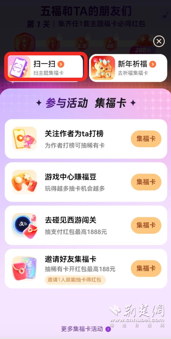 今年的集卡也比較多樣,除了經(jīng)典掃“福”字得卡,還可以掃所選IP主題的相關(guān)元素得卡,以“甄嬛傳”??槔c(diǎn)擊“掃一掃”選擇“探五?!保瑢?duì)著甄嬛、皇后等人掃描后,都出了幾張不同的甄嬛傳系列里的??āM瑫r(shí),看視頻、碰一下支付也可以得卡。