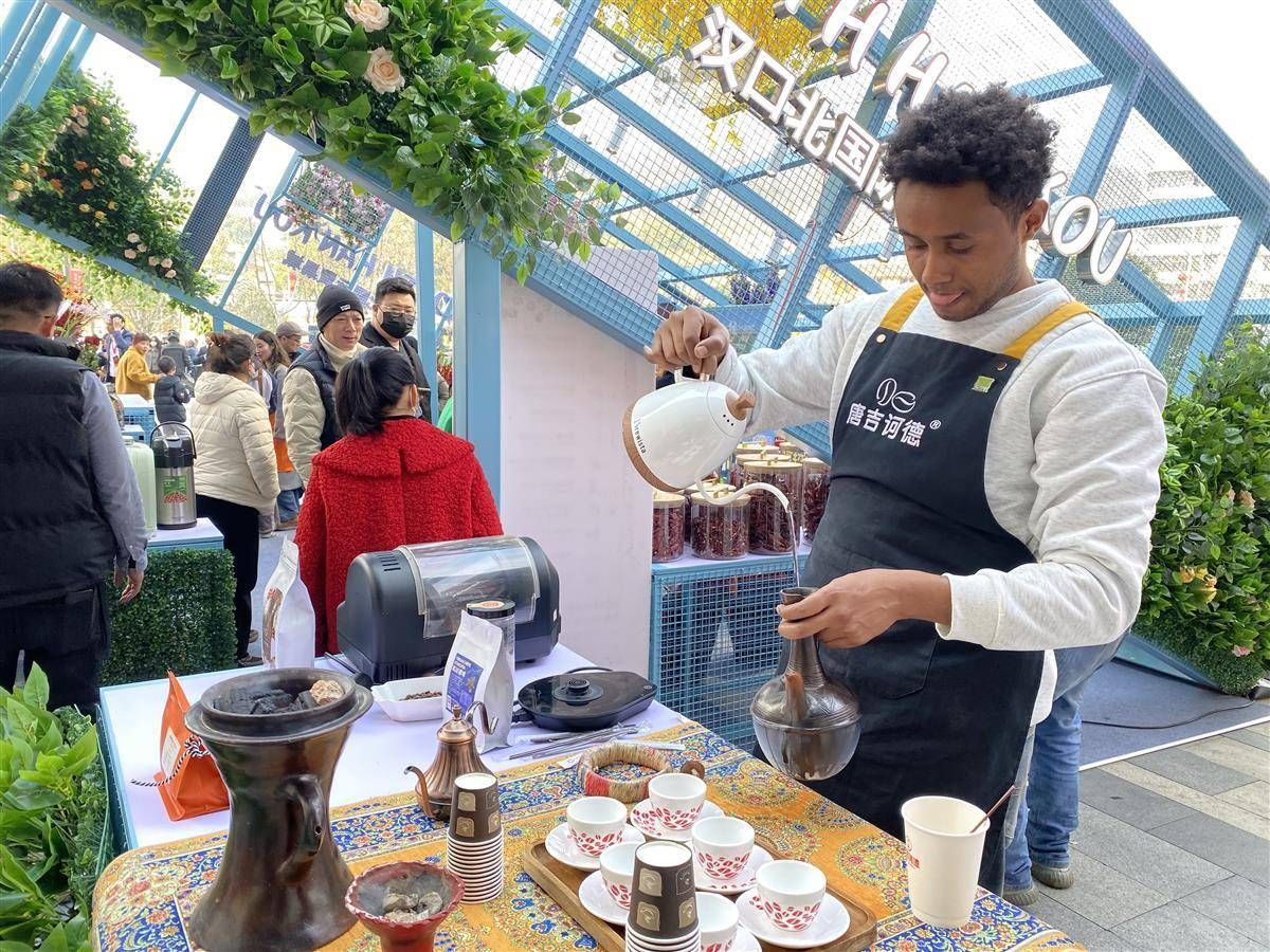 在武商夢時(shí)代“國潮好物市集”,埃塞俄比亞小伙貝卡·麥勒斯(Beka Melese)正在手沖咖啡招待顧客。(記者劉天縱攝)