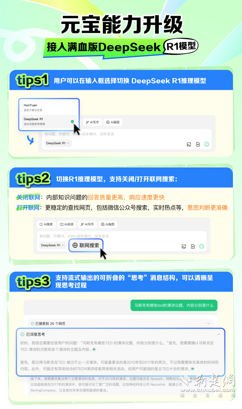 荊楚網(wǎng)(湖北日?qǐng)?bào)網(wǎng))訊(通訊員 袁軒)2月13日,騰訊AI助手“騰訊元寶”迎來重大更新,同時(shí)支持混元和DeepSeek兩大模型,打開騰訊元寶并進(jìn)入對(duì)話界面,即可免費(fèi)使用DeepSeek-R1滿血版模型。