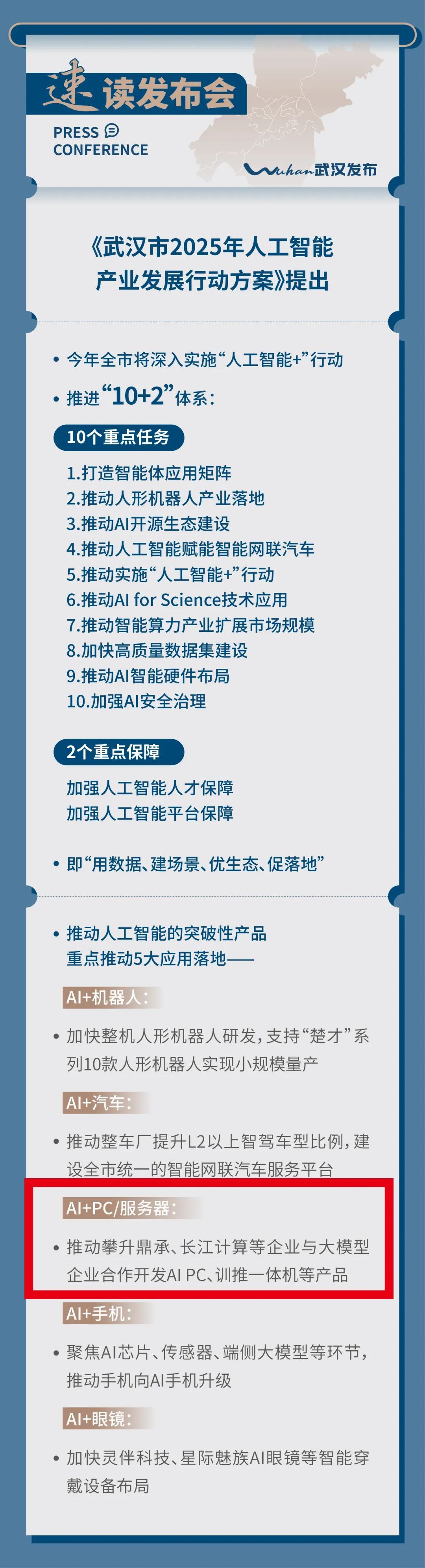 3月10日,《武漢市2025年人工智能產(chǎn)業(yè)發(fā)展行動方案》新聞發(fā)布會召開?!缎袆臃桨浮访鞔_將“AI+PC/服務(wù)器”列為推動人工智能的突破性產(chǎn)品,作為五大重點應(yīng)用之一予以落地,并點名支持攀升科技等企業(yè)聯(lián)合大模型廠商,攻關(guān) AIPC等產(chǎn)品。