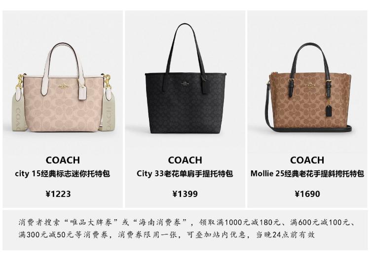 折扣不止于此,當(dāng)天上午10點(diǎn),消費(fèi)者搜索“唯品大牌券”或“海南消費(fèi)券”,可搶滿(mǎn)1000元減180元、滿(mǎn)600元減100元、滿(mǎn)300元減50元等消費(fèi)券,消費(fèi)券限用一張,當(dāng)晚24點(diǎn)前有效,可以和當(dāng)天活動(dòng)優(yōu)惠疊加使用——甚至還能用于五糧液等名酒。算下來(lái),Coach爆款托特包甚至僅為千元左右。