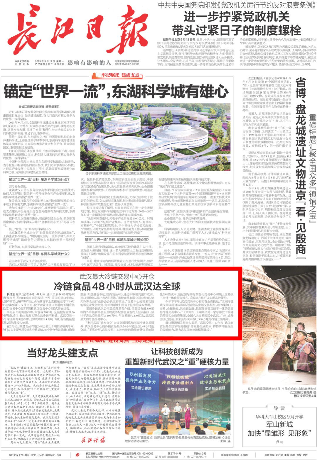 冷庫卷閘門緩緩打開,約3000噸來自阿根廷、巴西、美國的進(jìn)口牛肉以及國產(chǎn)禽類、海鮮等產(chǎn)品,從冷藏貨車上直接送至零下18℃的“超級冰箱”。5月18日,位于黃陂區(qū)灄口街道的玉湖冷鏈(武漢)交易中心(以下簡稱武漢交易中心)正式開倉運(yùn)營,這也是華中地區(qū)單體最大的冷鏈交易中心首倉。