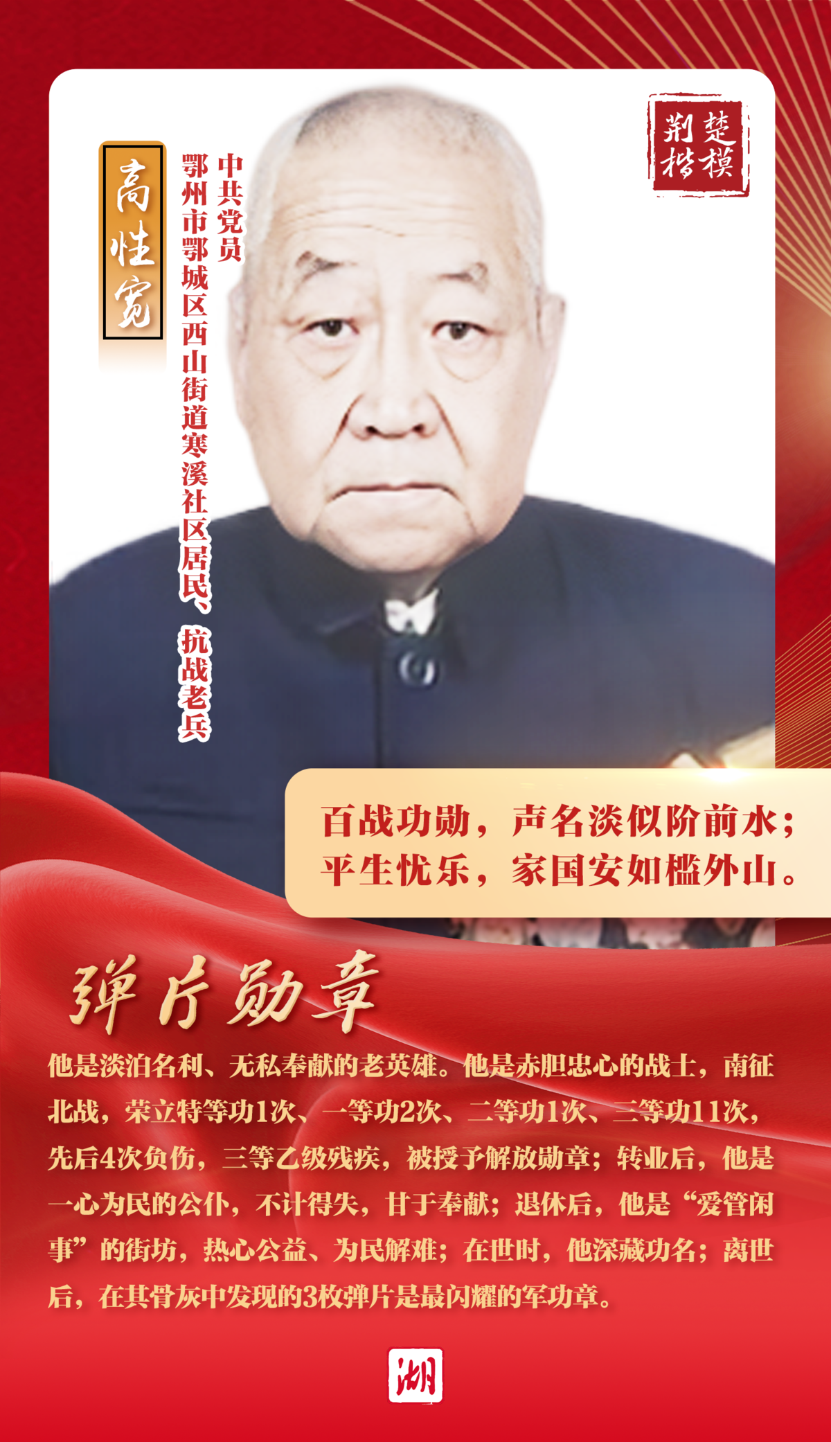 他是淡泊名利、無(wú)私奉獻(xiàn)的老英雄。他是赤膽忠心的戰(zhàn)士,南征北戰(zhàn),出生入死,榮立特等功1次、一等功2次、二等功1次、三等功11次,先后4次負(fù)傷,三等乙級(jí)殘疾,被授予解放勛章;轉(zhuǎn)業(yè)后,他是一心為民的公仆,不計(jì)得失,甘于奉獻(xiàn);退休后,他是“愛(ài)管閑事”的街坊,熱心公益、為民解難。在世時(shí),他深藏功名;離世后,其骨灰中發(fā)現(xiàn)的3枚彈片是最閃耀的軍功章。