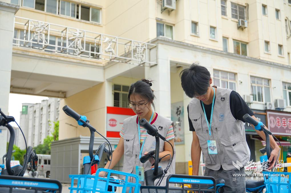 武漢輕工大學學生志愿者參與單車擺放。