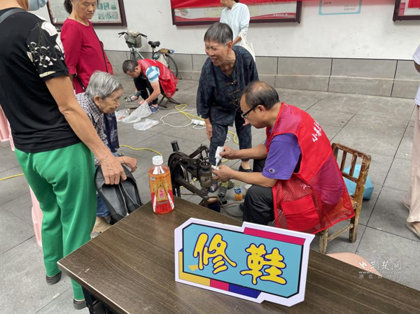 活動現(xiàn)場,磨刀、理發(fā)、修鞋等傳統(tǒng)便民服務(wù)點位前排起長隊。磨刀師傅手持磨刀石,動作嫻熟,“嚓嚓”聲中,一把把刀具煥然一新。理發(fā)師根據(jù)居民需求精心修剪發(fā)型,70歲的王大爺理完發(fā)后對著鏡子贊嘆:“手藝比理發(fā)店還好,還免費,真是方便!”修鞋攤前,師傅用專業(yè)工具修補鞋履,居民們看著修好的鞋子紛紛豎起大拇指:“這手藝,絕了!”