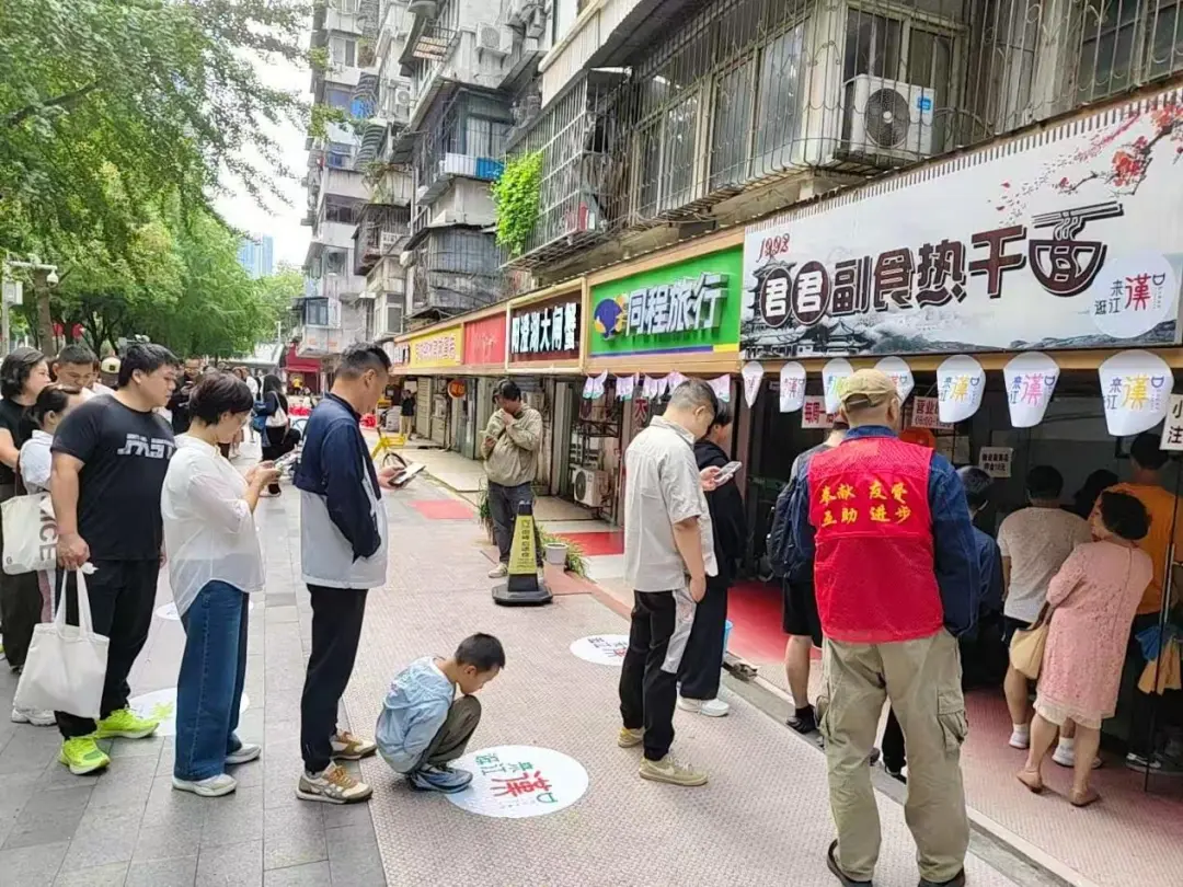 國(guó)慶中秋假期,江漢區(qū)游客量激增,君君副食的隊(duì)伍從店門(mén)口蜿蜒著排出數(shù)十米。社區(qū)志愿者舉著醒目的提示牌引導(dǎo)停車(chē),網(wǎng)格員把路邊的共享單車(chē)統(tǒng)一移走,引導(dǎo)著慕名而來(lái)的食客井然有序地排隊(duì)等候。“以前一到節(jié)假日就發(fā)愁,客人擠得轉(zhuǎn)不開(kāi)身,現(xiàn)在有專人維持秩序,生意反而更穩(wěn)當(dāng)了?!钡曛饔喟⒁滩林~頭的汗笑言。