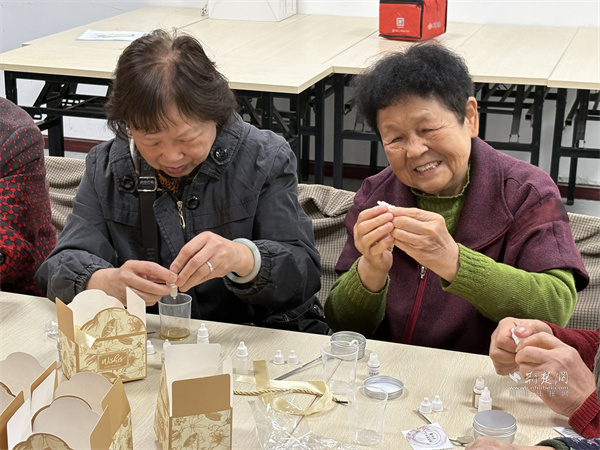 在大歌笛湖小區(qū)鄰里客廳內(nèi)熱鬧非凡,水拓扎染絲巾的制作現(xiàn)場(chǎng),老人們按照工作人員講解的步驟興致勃勃地動(dòng)手實(shí)踐,讓一幅幅色彩斑斕、花紋各異的絲巾作品逐漸成型,老人們拿著自己親手制作的絲巾,成就感滿滿。天然蜂蠟護(hù)手霜DIY環(huán)節(jié),大家按照配比將蜂蠟、橄欖油等材料混合加熱、攪拌、裝罐,制作出天然無(wú)添加的護(hù)手霜,既實(shí)用又健康。鄰里客廳外的便民服務(wù)也同步貼心上線,免費(fèi)理發(fā)、血壓測(cè)量、法律咨詢(xún)等服務(wù),切實(shí)幫助老年人解決實(shí)際需求,讓“笛韻”成為串聯(lián)健康、睦鄰、便利生活的“銀齡生活協(xié)奏曲”,串聯(lián)起銀齡幸福生活。