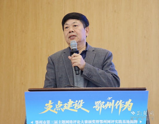 頒獎活動現(xiàn)場,湖北省社會科學(xué)院原副院長、省政府咨詢委員、長江經(jīng)濟(jì)帶智庫聯(lián)盟秘書長秦尊文受邀出席,并從網(wǎng)評的角度,圍繞“弘揚花湖精神 助力支點建設(shè)”主題,發(fā)表了主旨演講。他結(jié)合最新公布的《中共中央關(guān)于制定國民經(jīng)濟(jì)和社會發(fā)展第十五個五年規(guī)劃的建議》,高屋建瓴分析了鄂州當(dāng)前的經(jīng)濟(jì)形勢,提出了切實可行的建議。湖北省委直屬機(jī)關(guān)工委干部馮歡以中央網(wǎng)信辦網(wǎng)絡(luò)評論“創(chuàng)四優(yōu)”競賽獲獎作者身份,分享了自己多年網(wǎng)評文章寫作的心得體會,風(fēng)趣幽默、干貨滿滿。