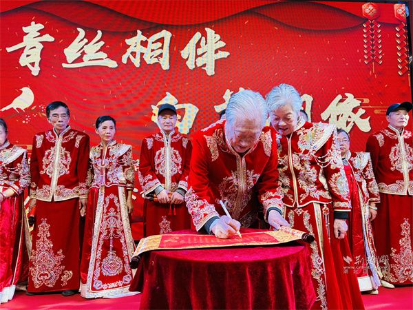 隨著輕柔音樂響起,身著中式禮服的夫婦們手挽手踏上紅毯。歲月雖在臉龐刻下痕跡,卻擋不住眼中對(duì)彼此的溫柔。他們共同執(zhí)筆書寫婚書,一撇一捺間重溫“執(zhí)子之手”的初心;交杯共飲合巹酒,延續(xù)“同甘共苦”的承諾;交換黑檀朱砂掛件,“你一半我一半”的信物成了彼此最深的牽絆。在婚姻登記處頒證員的見證下,夫婦們接過“結(jié)婚紀(jì)念證書”與鮮花,現(xiàn)場(chǎng)掌聲、祝福聲此起彼伏。