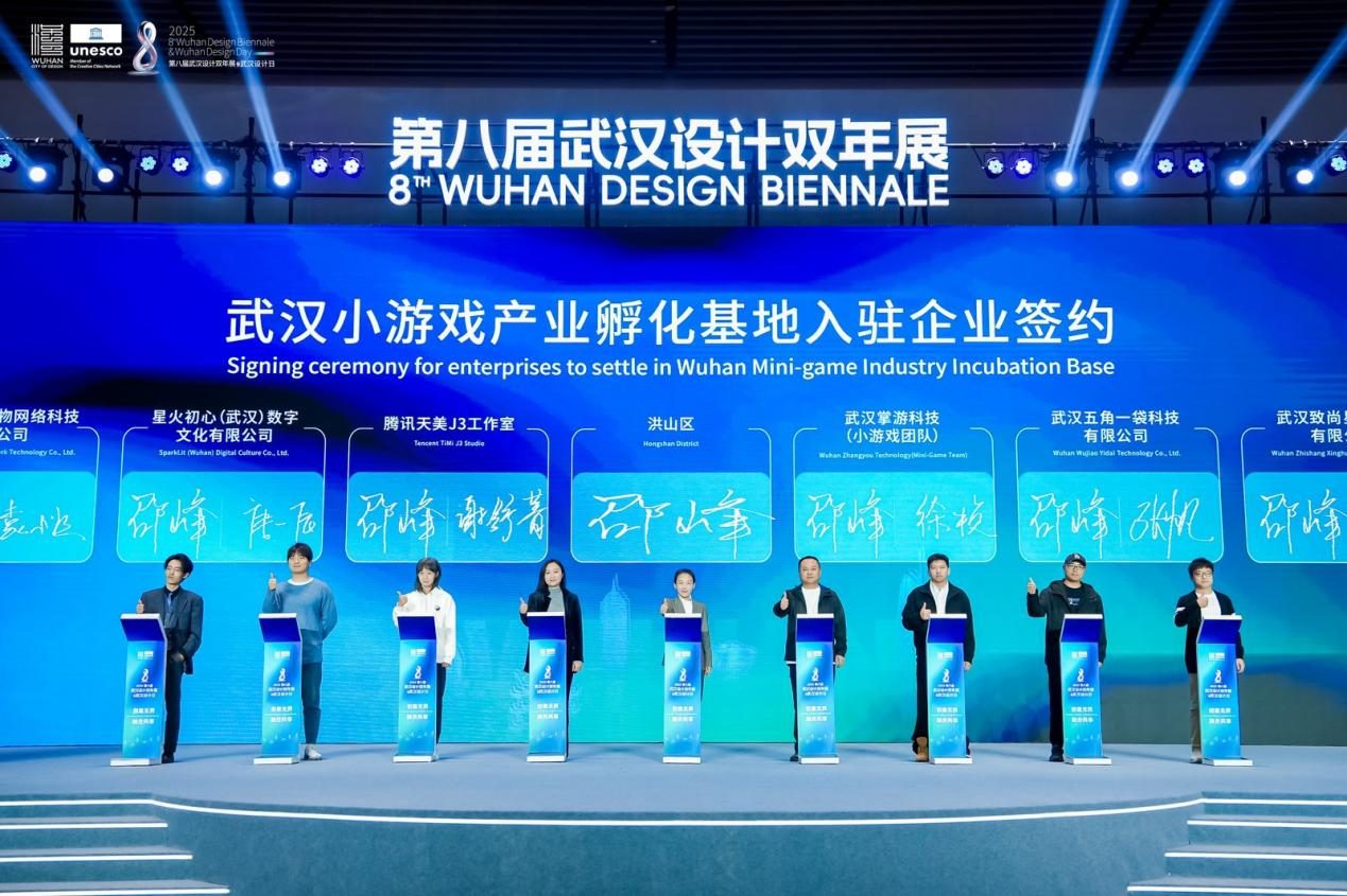 榮譽(yù)之外,產(chǎn)業(yè)合作是設(shè)計(jì)價(jià)值轉(zhuǎn)化的關(guān)鍵。開幕式現(xiàn)場(chǎng),8家企業(yè)簽約入駐全國(guó)首家小游戲產(chǎn)業(yè)孵化基地——“武漢市小游戲產(chǎn)業(yè)孵化基地”,他們中既有充滿朝氣的新生代小游戲團(tuán)隊(duì),也有掌游科技這樣的行業(yè)領(lǐng)軍者,更有騰訊天美J3工作室等頂尖力量,他們將攜手打破行業(yè)邊界、共享資源平臺(tái),共同推動(dòng)數(shù)字創(chuàng)意產(chǎn)業(yè)與設(shè)計(jì)融合發(fā)展。