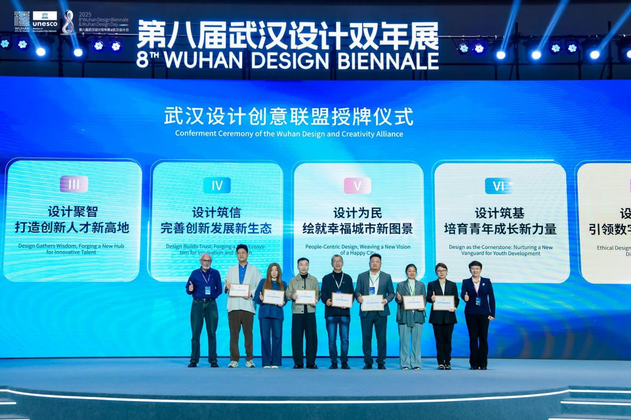 武漢有設(shè)計(jì)相關(guān)專業(yè)高校50余所,設(shè)計(jì)專業(yè)在校學(xué)生近10萬人,設(shè)計(jì)相關(guān)企業(yè)突破1萬家,10余個(gè)設(shè)計(jì)行業(yè)協(xié)會(huì),從業(yè)人員超50萬,形成了強(qiáng)大的“設(shè)計(jì)創(chuàng)意聯(lián)盟”,催生出了集產(chǎn)業(yè)鏈、創(chuàng)新鏈、人才鏈、價(jià)值鏈于一體的融合創(chuàng)新發(fā)展生態(tài)體系。在開幕式的最后,“武漢設(shè)計(jì)創(chuàng)意聯(lián)盟”正式授牌,來自設(shè)計(jì)企業(yè)、行業(yè)協(xié)會(huì)、高校院所和獨(dú)立設(shè)計(jì)師等領(lǐng)域多元設(shè)計(jì)力量代表共同見證。未來,“武漢設(shè)計(jì)創(chuàng)意聯(lián)盟”將奮力實(shí)現(xiàn)設(shè)計(jì)融城,構(gòu)筑協(xié)同發(fā)展新范式;設(shè)計(jì)賦能,激活產(chǎn)業(yè)升級(jí)新動(dòng)能;設(shè)計(jì)聚智,打造創(chuàng)新人才新高地;設(shè)計(jì)筑信,完善創(chuàng)新發(fā)展新生態(tài);設(shè)計(jì)為民,繪就幸福城市新圖景;設(shè)計(jì)筑基,培育青年成長(zhǎng)新力量;設(shè)計(jì)向善,引領(lǐng)數(shù)字文明新航向;設(shè)計(jì)聯(lián)通,拓展國(guó)際交往新空間八大目標(biāo)。