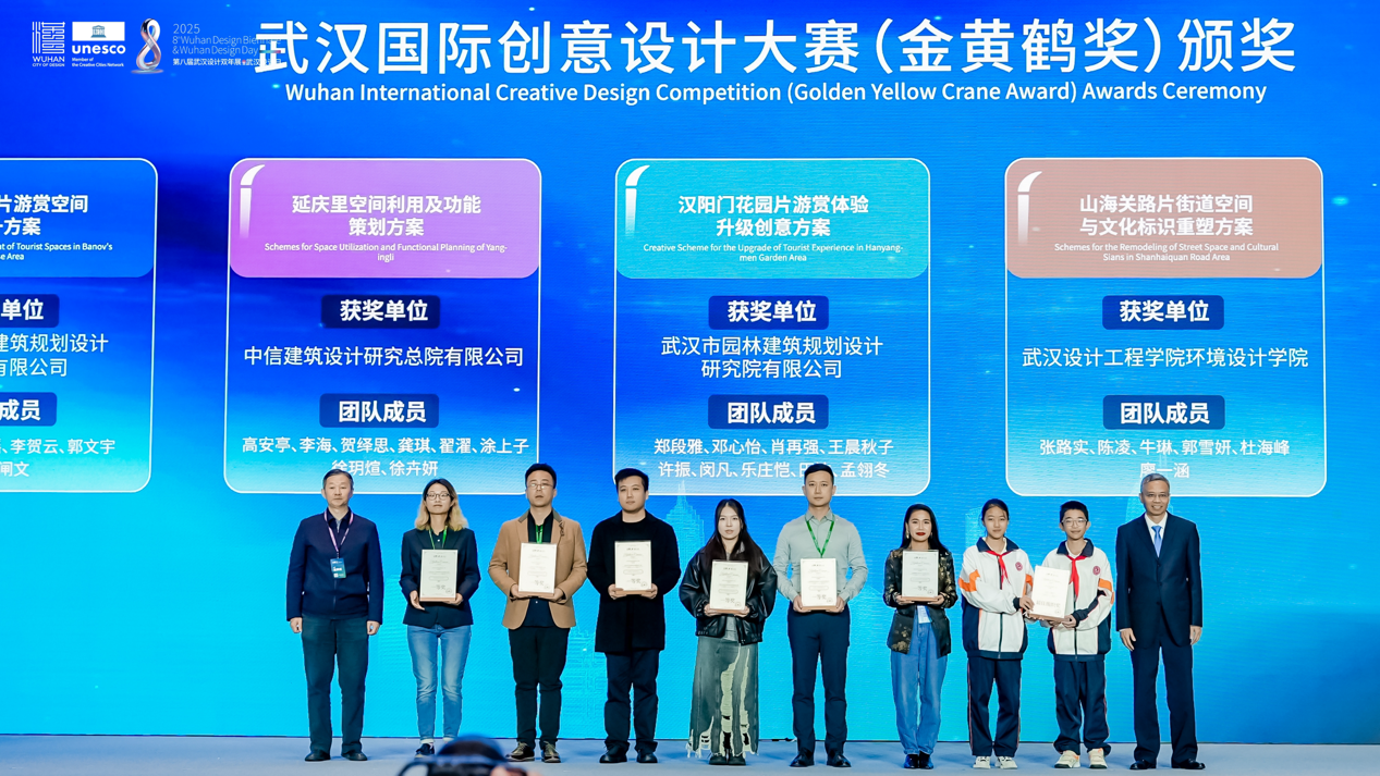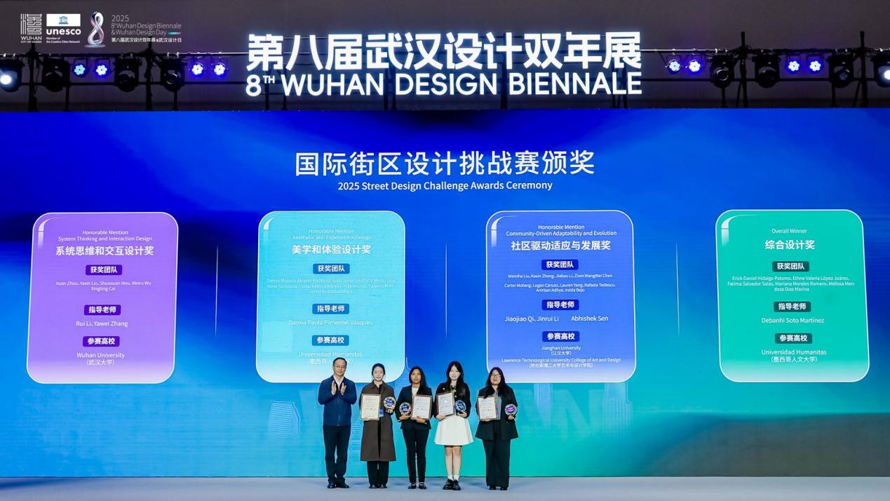 開幕式上,2025年武漢國(guó)際創(chuàng)意設(shè)計(jì)大賽(金黃鶴獎(jiǎng))與 2025年國(guó)際街區(qū)挑戰(zhàn)賽頒獎(jiǎng)儀式同步舉行。其中,象征武漢設(shè)計(jì)創(chuàng)新探索的“金黃鶴獎(jiǎng)”,今年特意選取黃鶴樓、山海關(guān)路、漢陽門等市民常去、關(guān)注度高、滿滿煙火氣的城市地標(biāo)作為設(shè)計(jì)對(duì)象,不限專業(yè)和地域,征集更宜人的更新提升方案?,F(xiàn)場(chǎng),武漢瑞拓建筑設(shè)計(jì)咨詢有限公司等6個(gè)專業(yè)組一等獎(jiǎng)和最佳組織獎(jiǎng)武漢市七一華源中學(xué)等獲獎(jiǎng)代表接受頒獎(jiǎng)。國(guó)際街區(qū)挑戰(zhàn)賽,則是由聯(lián)合國(guó)教科文組織設(shè)計(jì)之都城市聯(lián)合舉辦,全球高校團(tuán)隊(duì)共同參與的國(guó)際設(shè)計(jì)賽事。經(jīng)過全球30位權(quán)威專家1個(gè)月的精心細(xì)致評(píng)審,選出了四個(gè)優(yōu)勝方案?,F(xiàn)場(chǎng),為交互設(shè)計(jì)獎(jiǎng)獲獎(jiǎng)團(tuán)隊(duì)武漢大學(xué)、美學(xué)設(shè)計(jì)獎(jiǎng)獲獎(jiǎng)團(tuán)隊(duì)墨西哥人文大學(xué)、社區(qū)發(fā)展獎(jiǎng)獲獎(jiǎng)團(tuán)隊(duì)江漢大學(xué)團(tuán)隊(duì)和美國(guó)勞倫斯理工大學(xué)團(tuán)隊(duì),以及綜合設(shè)計(jì)獎(jiǎng)獲獎(jiǎng)團(tuán)隊(duì)墨西哥人文大學(xué)頒獎(jiǎng)。