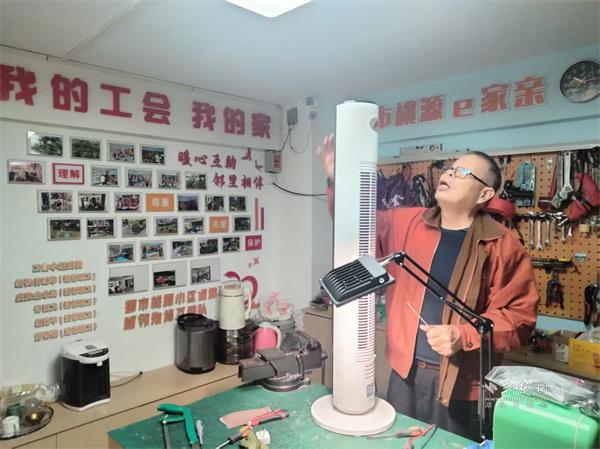 這個充滿煙火氣的共享工具空間,位于社區(qū)17棟架空層。雖面積不大,卻五臟俱全,墻上整齊擺放著螺絲刀、萬用表、扳手、電鉆等各類工具,操作臺上堆滿居民送來的待修物品。來自小區(qū)的退休工程師志愿者分工明確,有的排查小家電故障,有的調(diào)試自行車零件,耐心傾聽需求、細(xì)致檢查物品,用專業(yè)素養(yǎng)贏得居民信賴。