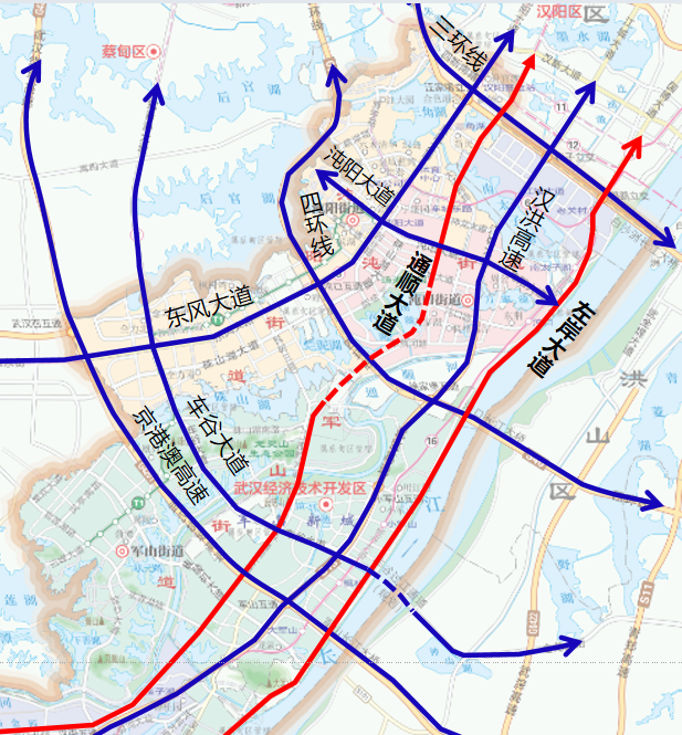 通順大道是武漢經(jīng)開區(qū)繼東風(fēng)大道、江城大道、左岸大道(沿江大道)之后連接主城區(qū)的第四條交通動脈,也是大漢陽片區(qū)交通一體化的重要組成部分。