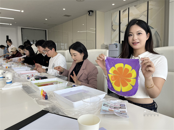 非遺手工絲巾水拓畫制作環(huán)節(jié),專業(yè)老師首先向黨員們介紹了絲巾水拓畫的歷史和制作技巧。在老師的指導下,黨員們紛紛拿起工具,發(fā)揮創(chuàng)意,將顏料滴入水中,通過輕輕攪拌和吹拂,讓顏料在水中自然暈染形成紋理后,將絲巾輕鋪在水面,色彩瞬間滲透,一幅幅絢麗的圖案便印染在了絲巾上。大家還邊制作邊交流討論,互相展示染好的作品,歡聲笑語不斷。