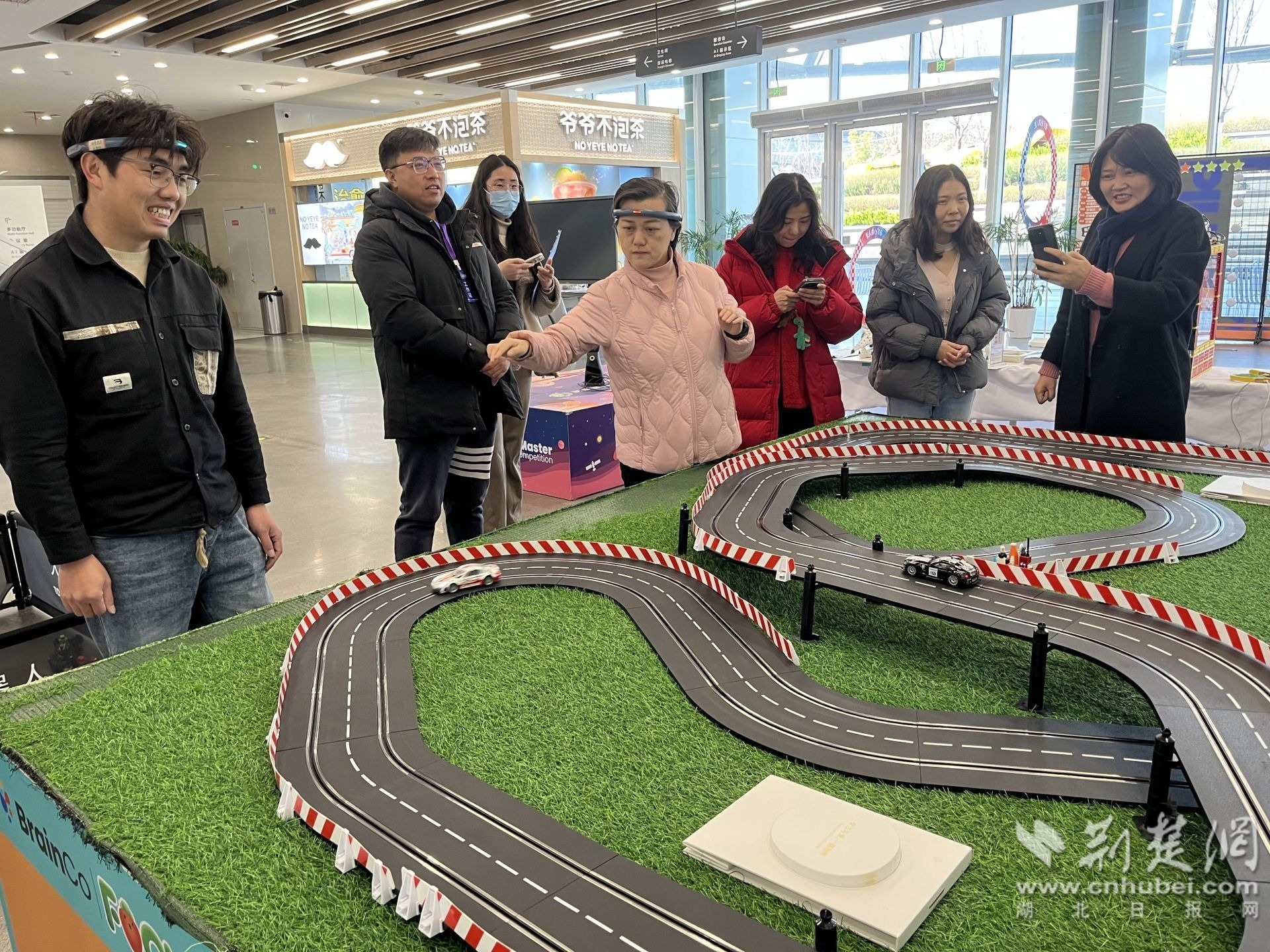 在工作人員的引導(dǎo)下,大家依次體驗(yàn)了多項(xiàng)科技互動(dòng)項(xiàng)目。在智控機(jī)器狗展示區(qū),黨員們親手操作機(jī)器狗,近距離感受其靈活動(dòng)作與智能響應(yīng)能力;腦控賽車體驗(yàn)區(qū),大家?guī)夏X機(jī)智能頭環(huán),集中精神推動(dòng)小車前進(jìn),感受“意念控制”的科技魅力;VR重走長(zhǎng)征路體驗(yàn)中,黨員們佩戴設(shè)備后“置身”長(zhǎng)征途中,沉浸式體驗(yàn)革命先輩的奮斗歷程。