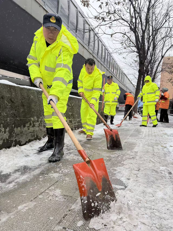 1月19日深夜至20日凌晨,隨著雪勢加大,街道應(yīng)急搶險隊(duì)伍迅速化身“風(fēng)雪夜行人”,頂著嚴(yán)寒奔赴一線。他們采取機(jī)械作業(yè)與人工作業(yè)相結(jié)合的方式,對轄區(qū)主次干道、橋梁、陡坡、十字路口等重點(diǎn)路段和易結(jié)冰區(qū)域,進(jìn)行循環(huán)撒布融雪鹽和清掃作業(yè),最大限度預(yù)防道路結(jié)冰。寒夜中,隊(duì)員們衣衫被雪花浸濕,臉頰被寒風(fēng)凍紅,但無人退縮,持續(xù)堅(jiān)守。天色微明,雪勢稍歇,隊(duì)伍立即轉(zhuǎn)戰(zhàn),對背街小巷、人行道、天橋等區(qū)域的殘留積雪進(jìn)行清理,并在坡道、臺階等易滑處鋪設(shè)防滑草墊、設(shè)置警示標(biāo)識,全力保障早高峰出行安全順暢。