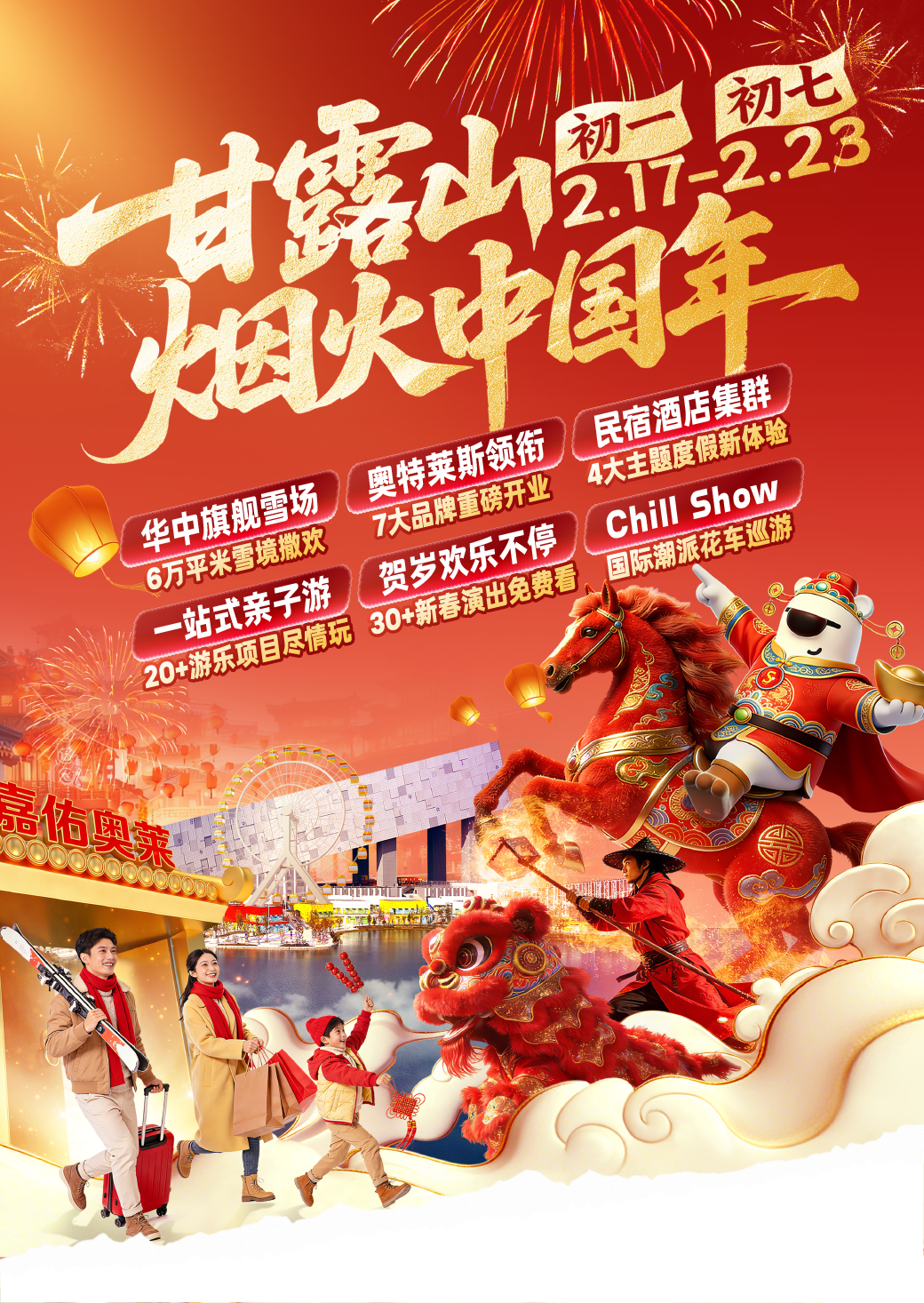 甘露山文創(chuàng)城煙火中國(guó)年作為重磅項(xiàng)目,連續(xù)7天呈現(xiàn)水上非遺火龍鋼花、瀑布煙花、光影秀、財(cái)神巡游等精彩內(nèi)容,打造集視覺(jué)震撼、文化體驗(yàn)、休閑購(gòu)物于一體的綜合性節(jié)日度假目的地。