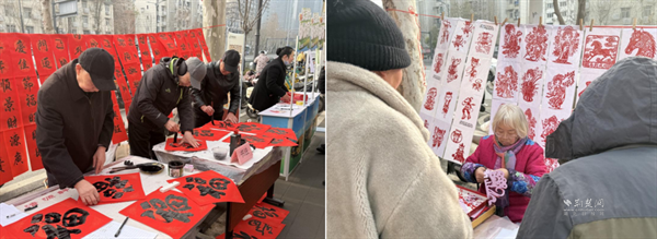 同一時間,在四美塘社區(qū),大紅的春聯(lián)紙、精致的剪紙作品與濃郁的墨香交織,勾勒出吉祥喜慶的新春圖景。武昌區(qū)社區(qū)教育學院楊園街分校的教師和學員們布置了書法創(chuàng)作區(qū)、剪紙展示區(qū),吸引眾多居民駐足觀賞。在書法創(chuàng)作區(qū),居民主動參與書寫體驗,在老師的指導下親手描繪新春祝福。在剪紙區(qū),精美的作品整齊陳列,居民們登記后即可領取,將這份獨特的新春祝福帶回家。