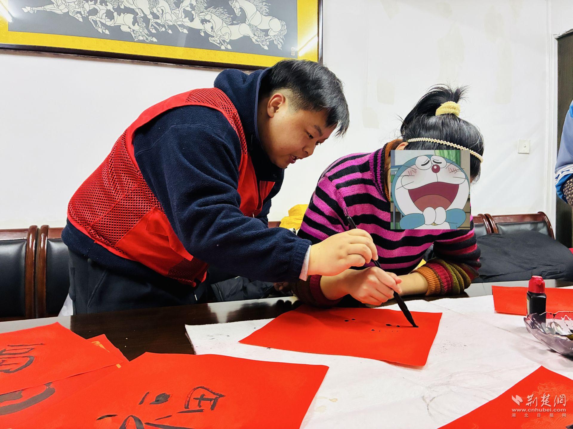 活動現(xiàn)場還設置了春聯(lián)書寫互動區(qū)。書法老師從握筆姿勢、用筆力度講起,耐心示范基礎筆法,并根據(jù)每個人的情況進行指導。筆墨鋪展間,一副副春聯(lián)逐漸成形,內(nèi)容樸實真切,寄托著對新一年的期望。