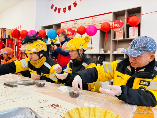活動現場,手工DIY區(qū)準備了糯米粉、黑芝麻餡、豆沙餡等原材料,黃鶴樓消防站的消防員與外賣騎手、快遞員們圍坐在一起,揉面、包餡、搓圓,體驗親手制作湯圓的樂趣。