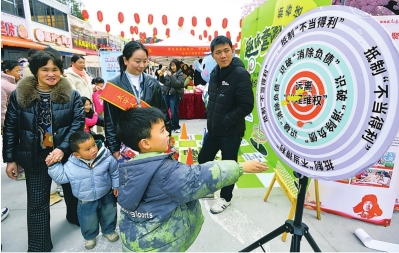小朋友在太平人壽游戲區(qū)玩飛鏢轉盤游戲。