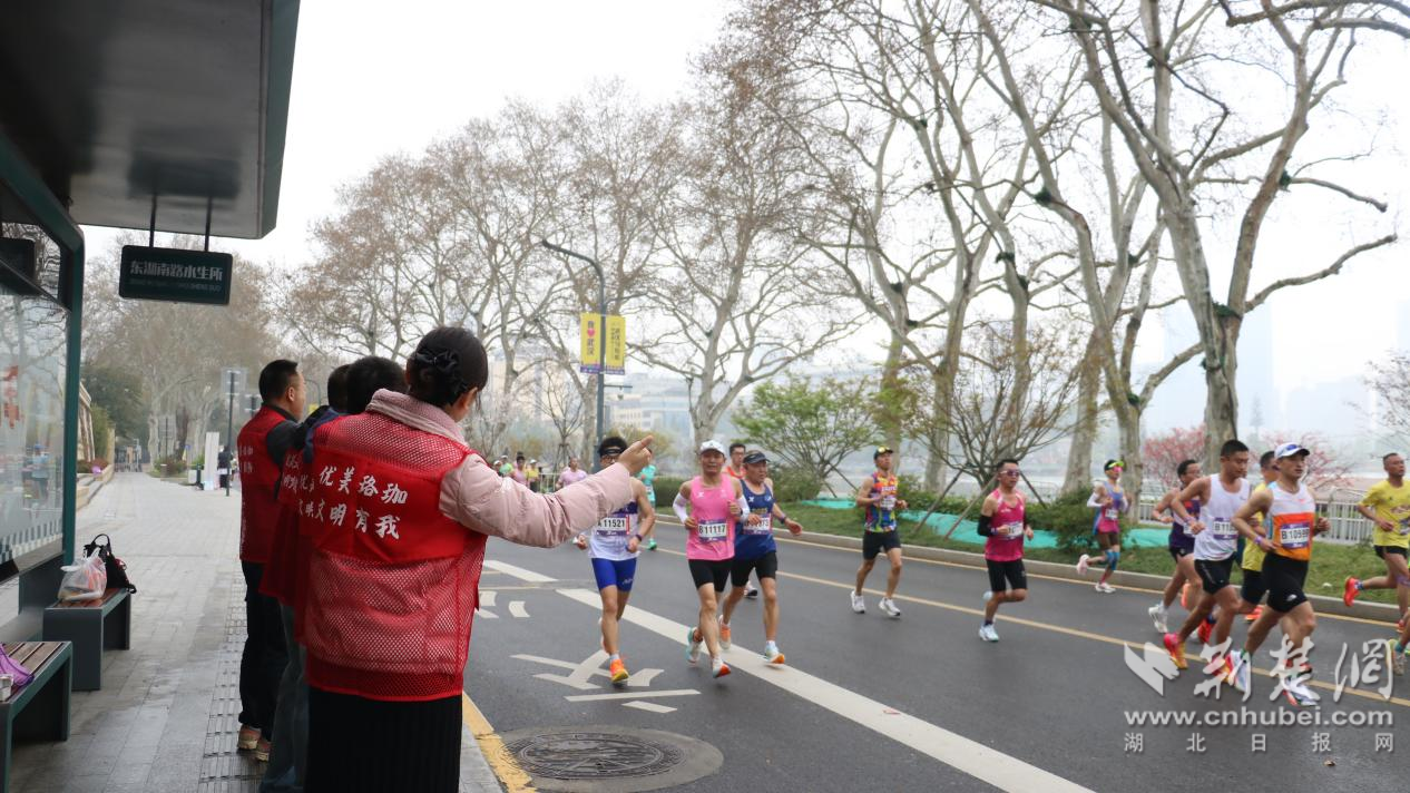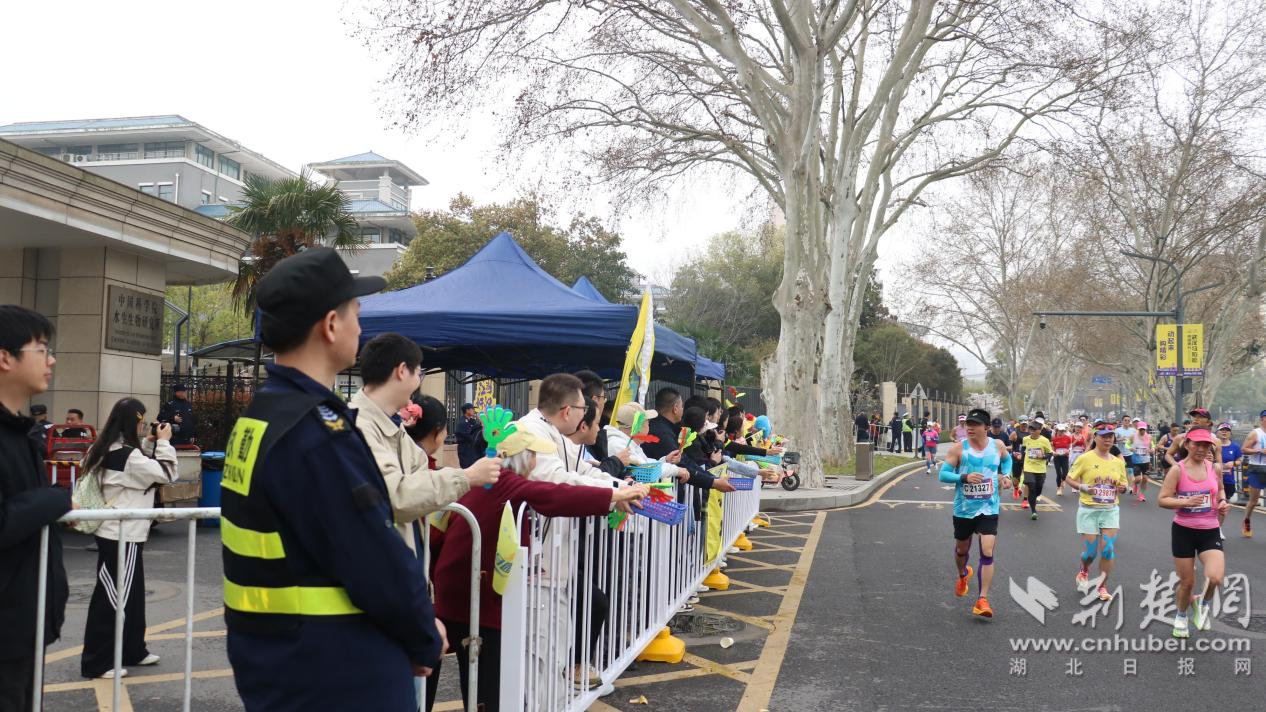 “加油!加油!”“你們是最棒的!”……當(dāng)天,位于賽道沿線的中國科學(xué)院水生生物研究所自發(fā)組織了“助威團(tuán)”??蒲腥藛T們暫時(shí)放下手中的顯微鏡,揮舞著彩旗和手舉牌,用最熱烈的吶喊為中外跑者加油鼓勁,將嚴(yán)謹(jǐn)科研之外的澎湃熱情灑滿賽道。除了吶喊助威,轄區(qū)共建單位還貼心地設(shè)置了“愛心補(bǔ)給站”,為跑者提供飲用水、水果等補(bǔ)給物資,不僅為選手們“充電”,更讓這場國際賽事充滿了“珞珈溫度”。
