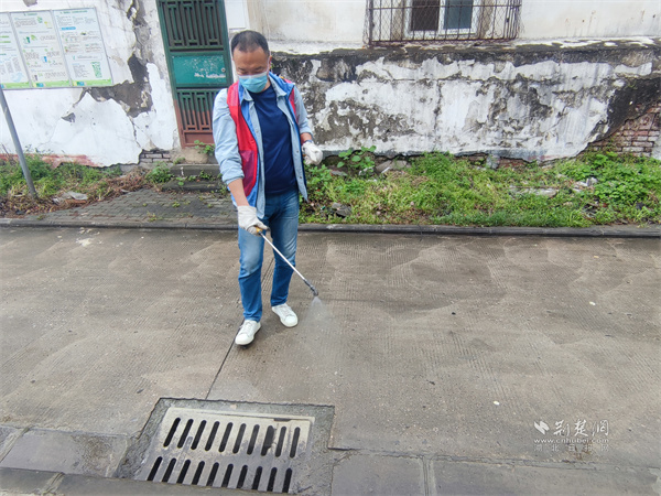消殺人員對(duì)積水消退區(qū)域噴灑消毒。 通訊員供圖