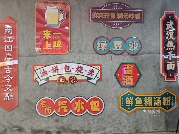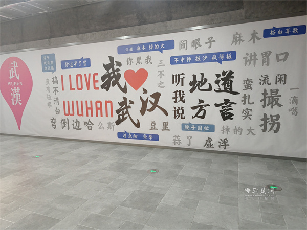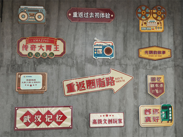 在武商超市胭脂路店前,那面“方言文化墻”便是最生動的注解。墻面中央,“我愛武漢”的大字旁,是“零醒、麻木、掉的大”“鬧眼子”“蠻扎實”等一串地道漢味俚語,保留了本土語言那股子鮮活、野性而直接的“脾氣”。側(cè)面墻上點綴的復(fù)古收音機、老式相機裝飾牌,與“重返胭脂路”、“武漢記憶”的標(biāo)識,共同構(gòu)成了一扇通往舊日時光的“穿梭門”。