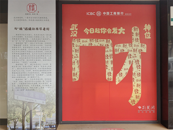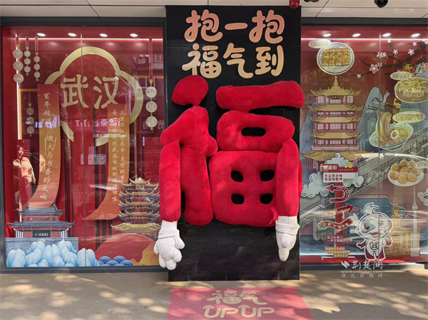 在工商銀行糧道街支行的墻面上,一個用紅色毛絨打造的巨型“?!弊盅b置,正伸出憨態(tài)可掬的“手臂”,熱情地向路人發(fā)出邀請——“抱一抱,福氣到”。配合地面“福氣UPUP”的躍動光影,冰冷的建筑立面被瞬間激活,化為一個充滿人情味與互動感的“福氣地標(biāo)”,吸引人們駐足擁抱、合影留念。就在一旁,一幅色彩斑斕的“武漢美食地圖”櫥窗徐徐展開,黃鶴樓的巍峨與熱干面、豆皮的市井風(fēng)味奇妙同框,卡通的吉祥物熱情招手,將“舌尖尋古味,巷深有乾坤”的故事,直觀地講述給每一位行人。
