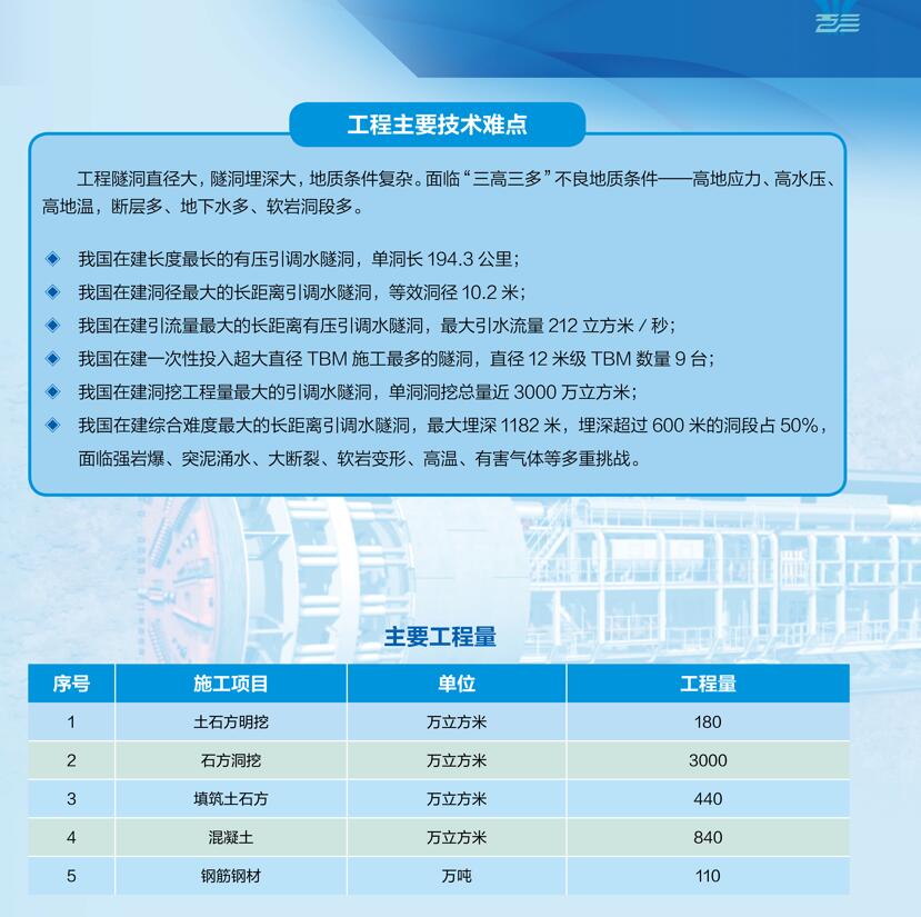 據(jù)介紹,工程輸水總干線采用有壓單洞自流輸水,沿線地質(zhì)條件復(fù)雜,面臨強巖爆、突泥涌水、大斷裂、軟巖變形、高溫、有毒氣體等多重挑戰(zhàn),施工難度極大。工程設(shè)計與施工將再一次提升我國水利建設(shè)科技能力。