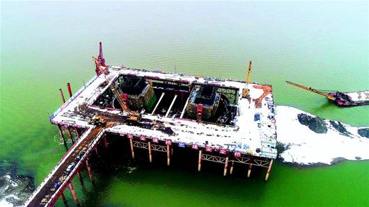 1月1日,建設(shè)者在赤壁長江大橋上忙碌著。連日來,中鐵大橋局五公司項(xiàng)目部廣大建設(shè)者放棄元旦節(jié)日休息,不分晝夜,不畏嚴(yán)寒,加緊 施 工 ,于2018年 12月31日完成南岸灘橋首個(gè)水中墩承臺(tái)施工。目前南岸灘橋11個(gè)水中墩承臺(tái),已經(jīng)開工9個(gè),各作業(yè)點(diǎn)全面開花。(視界網(wǎng)馬永斌 攝)