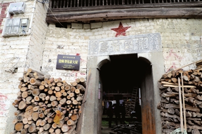 在該村5組饒獅壟包家,有一處老宅格外引人注目。一顆碩大的紅五星下面的門楣上,鐫刻“龍圖衍慶”四個碩大的繁體字。屋子的門窗、樓閣上雕滿精致的圖案,仔細辨認,可以看出是古裝戲文。