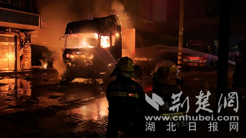 圖為消防指戰(zhàn)員撲滅貨車火災現場。 肖幫治攝
