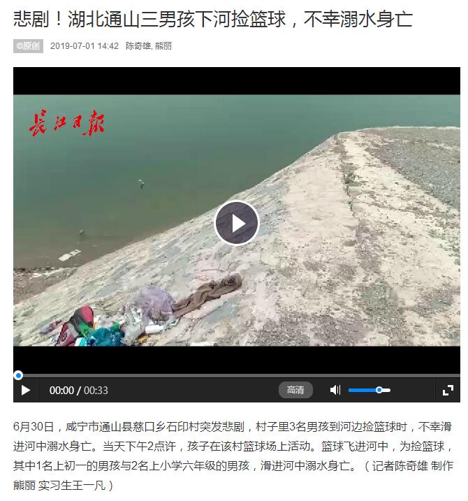 6月30日,咸寧市通山縣慈口鄉(xiāng)石印村突發(fā)悲劇,村子里3名男孩到河邊撿籃球時,不幸滑進(jìn)河中溺水身亡。當(dāng)天下午2點許,孩子在該村籃球場上活動?;@球飛進(jìn)河中,為撿籃球,其中1名上初一的男孩與2名上小學(xué)六年級的男孩,滑進(jìn)河中溺水身亡。(記者陳奇雄 制作 熊麗 實習(xí)生王一凡)