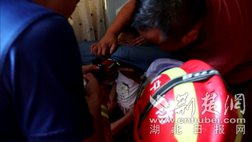 圖為消防員救出小孩現(xiàn)場(chǎng)。 朱濤攝