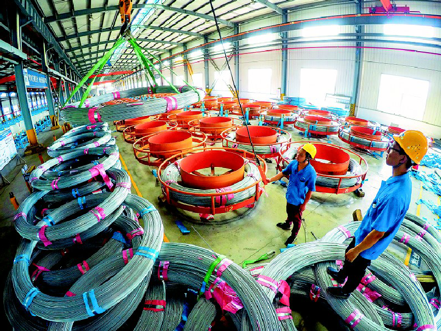 圖為:在嘉魚縣經(jīng)濟(jì)開發(fā)區(qū)官橋工業(yè)園內(nèi),湖北歐維姆纜索制品有限公司員工在加工大橋主纜索股。(湖北日?qǐng)?bào)全媒記者 陳勇 通訊員 張育明 攝)
